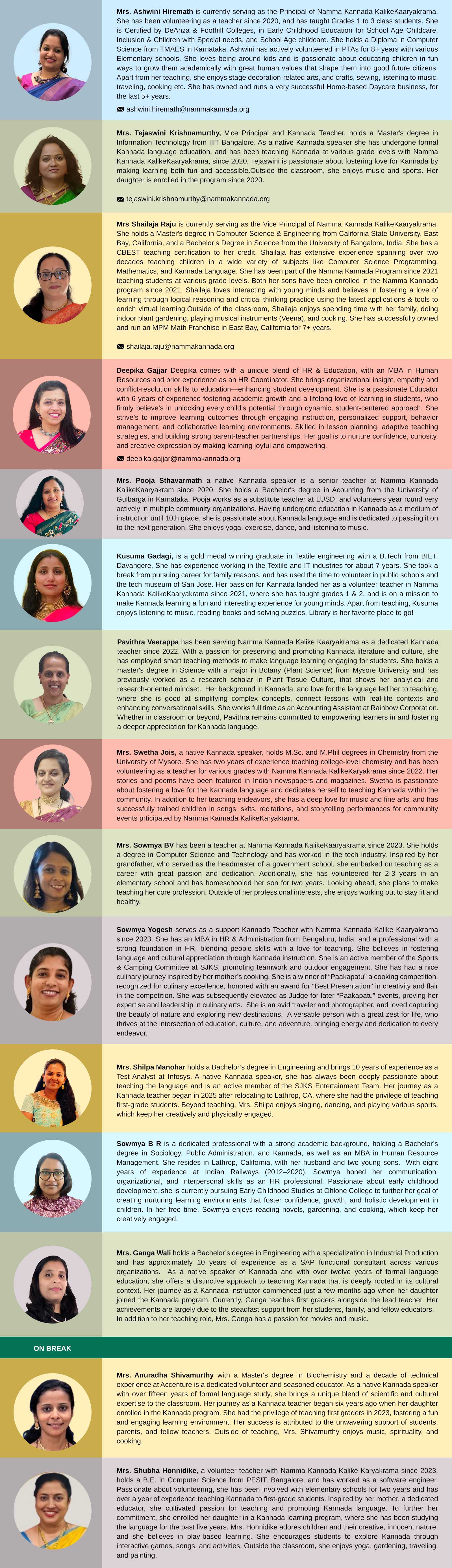 At Namma Kannada Kalike Kaaryakrama all of the teachers without exception are native Kannada speakers, born and schooled in Karnataka state before immigrating to the United States. Many of our teachers have their own children in the program, enhancing their dedication to maintaining and improving the quality of our education for the benefit of all students.